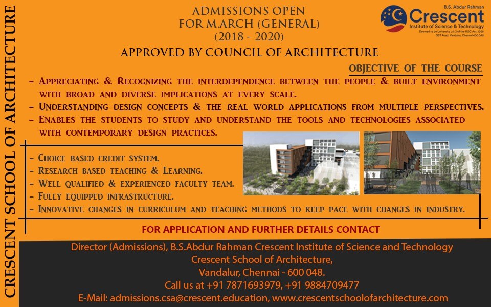 The Crescent School of Architecture affiliated by CoA (Council of Architecture) established in the year 2010 as one of the constituent Schools of the B.S. Abdur Rahman Crescent Institute of Science & Technology, Vandalur, Chennai, contemplates on a Philosophy as an off-shoot of the vision and mission of the university.